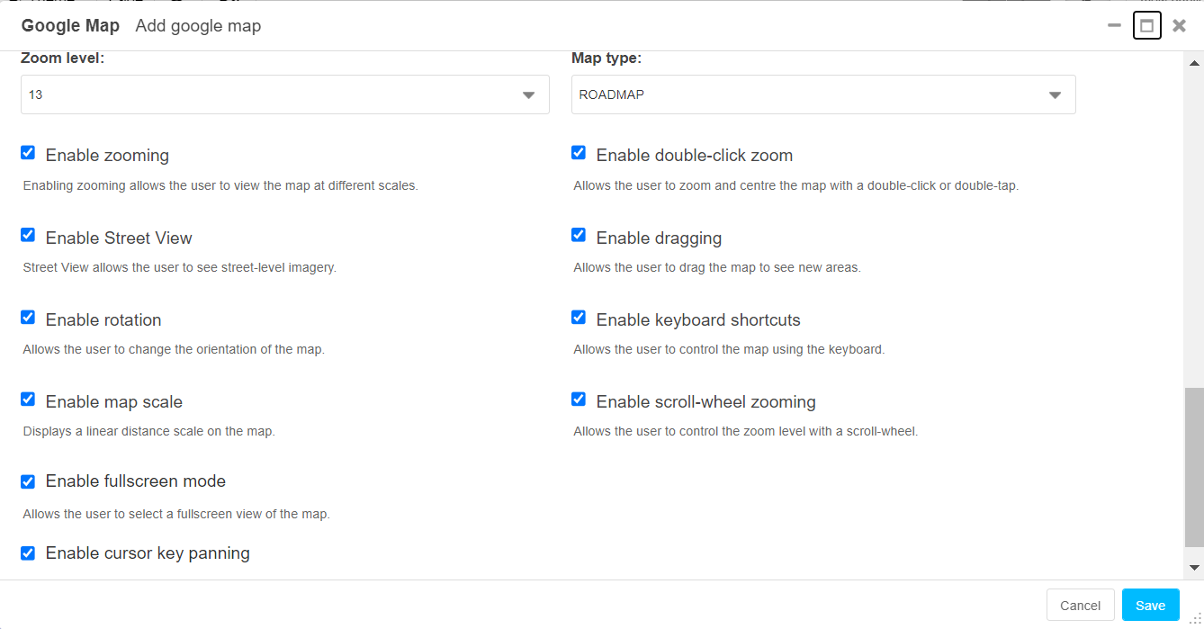 When a Google map is added there are different settings which can be used to change what is visible on the Google map. This gives you the opportunity to adjust it on your own needs, focusing on important locations and a pleasant display.