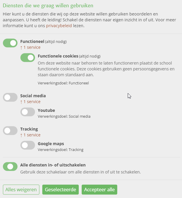 Wanneer er binnen bovenstaand voorbeeld geen Google Maps gebruikt zou worden, zou deze vraag ook niet in het cookie-scherm te voorschijn komen. Alle cookies zijn afzonderlijk aan en uit te zetten. Sinds versie 28.35 is deze functionaliteit beschikbaar.